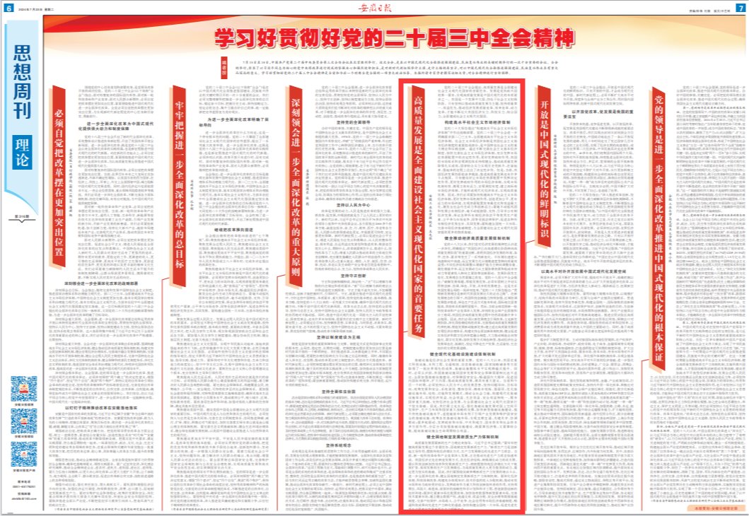 7月15日至18日,中国共产党第二十届中央委员会第三次全体会议在北京胜利举行。学习好贯彻好党的二十届三中全会精神是当前和今后一个时期全党全国的一项重大政治任务。《安徽日报》约请专家学者对全会精神进行宣传阐释。必赢王先柱教授以《高质量发展是全面建设社会主义现代化国...