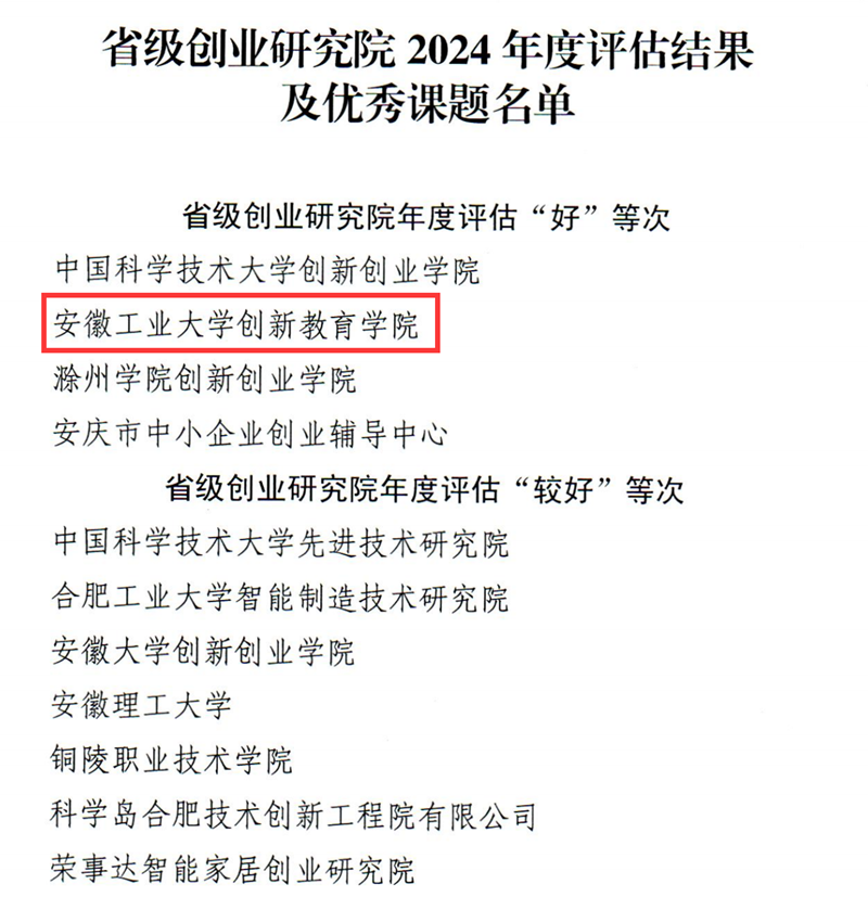 近日,安徽省人力资源和社会保障厅、省教育厅、省财政厅联合印发《关于印发省级创业研究院2024年度评估结果的通知》,必赢创新创业学院牵头的省级创业研究院年度评估荣获“好”等次,承担的课题《创新创业政策驱动新质生产力发展的机理及其提升策略研究》荣获“优秀”课题。202...