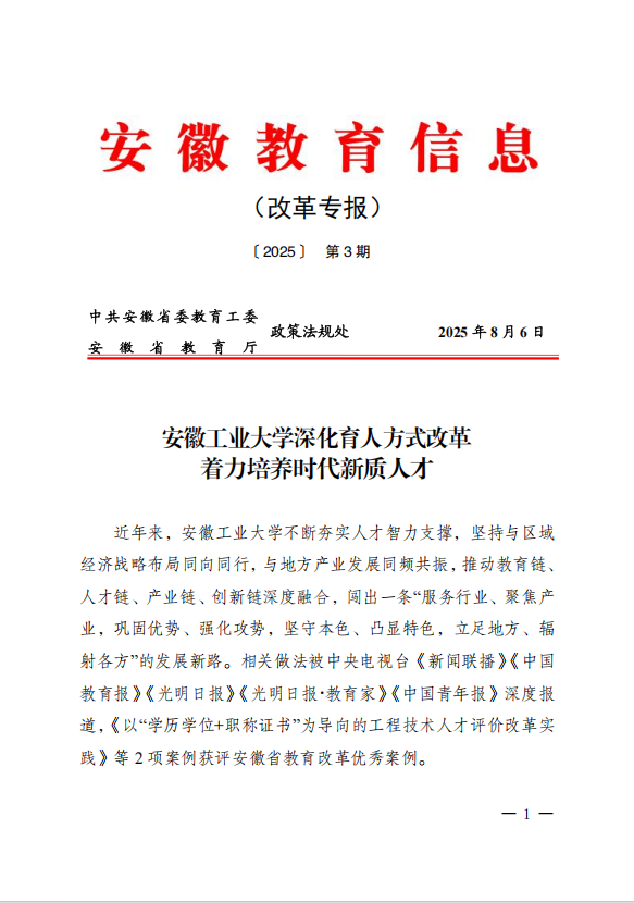 8月6日,《安徽教育信息(改革专报)》2025年第3期以《437bwin必赢国际官网深化育人方式改革 着力培养时代新质人才》为题,面向全省专题推介必赢服务区域产业发展,深化时代新质人才培养改革的举措与经验。(撰稿:张俞 屈桂春 审核:汪和平 方大春 张苒 黄敏)
