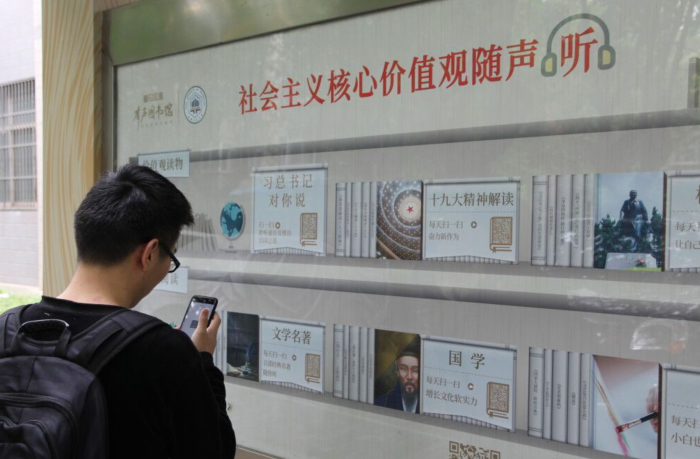 该“有声图书馆”以“社会主义核心价值观随身听”为主题,开设“价值观读物”、“全民阅读”、“学习加油站”等板块,包含“总书记对你说”、“榜样故事”、“名校公开课”等栏目,精选上千个由专业播音员录制的图书音频和语音节目,以二维码的形式呈现在校园的橱窗中,广大师生可以扫描二维码,通过手机随时随地收听相关内容。