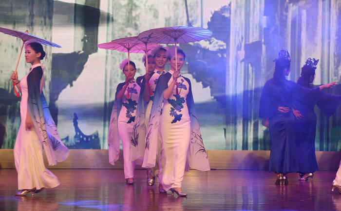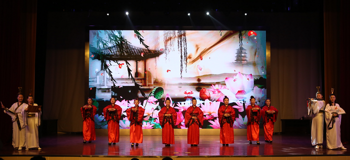 演出在计算机学院《礼仪之邦》雄浑的古典音律中拉开序幕,教师们身着曲裾、交领襦裙、齐胸襦裙、改良汉服等服饰,配以柔美俏丽舞蹈风格,展现出中华五千年文化源远流长的大气磅礴,观众仿佛穿梭于历史之长河,领略中华汉文化之魅力,感受华夏文明之灿烂与辉煌。创新教育学院演员们身披华丽汉服,展示儒雅之风,诠释着汉服的深刻内涵。体育部《炫动青春,魅舞绿茵》,动感带着节拍,健康透着活力,简单中不乏个性,休闲中感受时尚,彰显工作激情与运动健康。图书馆《徽州女人》让徽州斑驳清淡的青瓦白墙有了无尽柔情,为徽州浓郁沉厚的文化增添了别样光彩。商学院党政领导齐上阵,诠释着“三尺讲台”的含义,尽显新时代商院人的精气神。机关《东方旗袍》演绎了独特的旗袍文化,饱含着中国韵味,显示着中国魅力,它将中国女性贤淑、典雅、温柔的性情与气质,展现得淋漓尽致。艺设学院《缤纷色彩艺术人生》将整台演出推向高潮,女教师们用简单的纸质材料,通过折叠、切割、弯曲、编织等工艺,呈现出五彩斑斓的艺术效果,同时作品还创造性地汇入多种元素,有传统的草本图案,有现代的线条艺术,有象征着女性的花卉、蝴蝶等具象元素等,展现出艺设学院女教师的多样芳华。后勤处旗袍秀《山水丽人行》,在翩翩起舞间,展示了后勤“半边天”的优雅风采及“后名实先、勤必有为”的后勤人精神。离退休工作处带来的参演节目《祖国之恋》,展现出必赢离退休女教职工的良好精神风貌,凸显了老教师们热爱生活、享受生活的积极态度,向大家传递了满满的正能量。其他代表队在舞台中央也纷纷表演了精彩的节目。