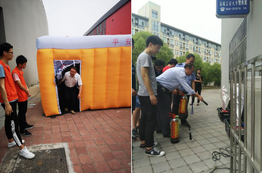 演练分两个部分:秀山校区研究生公寓4号组团开展了应急疏散演练;体育实训楼北侧广场开展模拟逃生及灭火技能培训。为了使演练活动取得良好效果,演练开始前,安全保卫部会同各相关部门多次沟通,制定了切实可行的活动方案。2点30分,随着警报声响起,演练正式开始,参加演练的全体留学生听到指令后,在志愿者的引导下沿着疏散路线指示标志迅速从高层向低层进行疏散,整个疏散过程快而有序。疏散完毕后志愿者们清点了人数,确认所有参加演练学生全部安全撤离,完成了此次防灾减灾逃生疏散的演练任务。体育实训楼北侧广场开展的模拟逃生,参演学生8人一组,按照逃生动作要领轻捂口鼻、弯腰躬身、有序进入“模拟烟雾逃生体验馆”,参加演练的同学们随后又参加了模拟灭火实训设备操作。