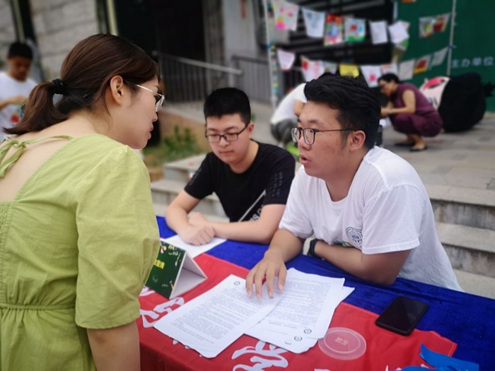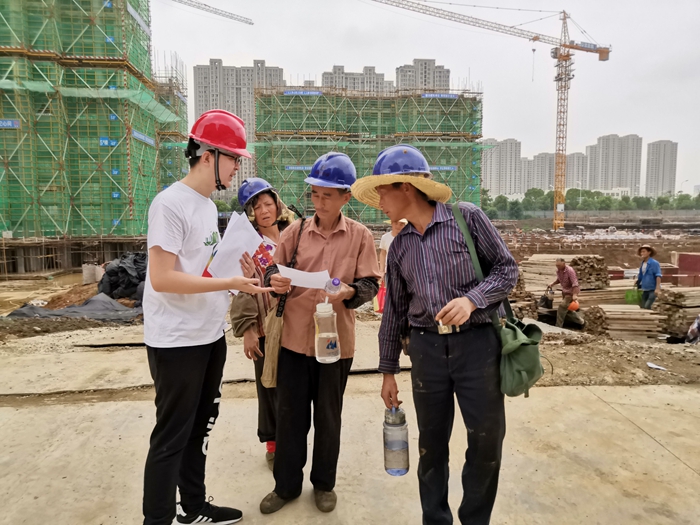 在某建筑工地内,一群头戴安全帽的青年学子在人群中穿梭不停,汗水早已浸湿了后背,脸上豆大的汗珠滑落,他们却浑然不觉。同学们一手拿着矿泉水,一手拿着法治宣传单,为烈日下辛勤工作的建筑工人们送上清凉,在休息的间隙向他们普及法律知识。“您好,我们提醒您维权过程中切不能采取暴力行为,一定要通过法律途径解决”、“是的,劳动合同的签订一定要注明用工单位的基本情况……”这是公法学院新时代“律博士”宣讲团的队员们在开展服务农民工普法宣传工作。
