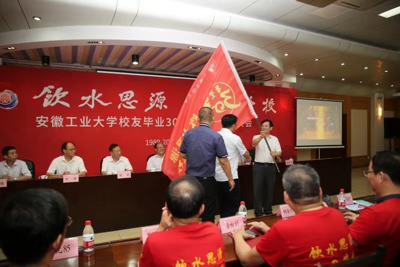 会上,校长魏先文向下一届校友毕业30周年返校活动筹备组两位校友代表黄贞益、孙斌授“饮水思源 爱国荣校”会旗。