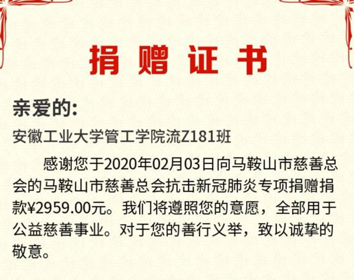 “亲爱的437bwin必赢国际官网管工学院流z181班,感谢您于2020年2月3日向马鞍山市慈善总会抗击新冠肺炎专项捐款……”前日,管工学院流Z181班的同学们收到了马鞍山市慈善总会发来的捐赠证书,而这还得从管工学院近期开展的一系列公益募捐活动说起。