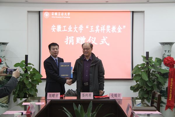 捐赠仪式上,双方签订捐赠协议。刘明代表学校教育发展基金会向王其祥颁发了捐赠证书和纪念品。