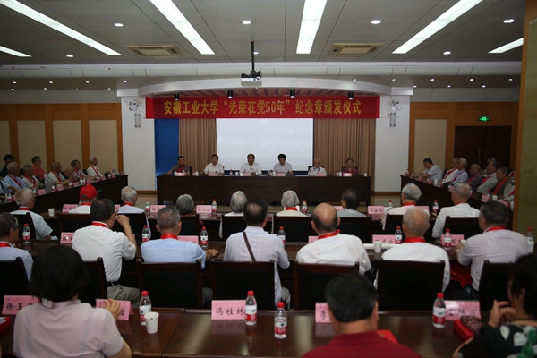 6月17日上午,必赢“光荣在党50年”纪念章颁发仪式在佳山校区学术会议中心举行。校党委书记刘新跃、校长魏先文、校党委副书记祖明出席仪式。颁发仪式由魏先文主持。