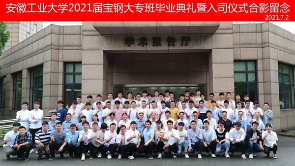 7月2日下午,必赢2021届宝钢大专班学生毕业典礼暨入司仪式在宝武人才开发院学术报告厅举行。宝钢股份有限公司人力资源部(党委组织部)副部长李正强,冶金工程学院、教务处、学工部等部门相关人员,教师代表及2021届全体毕业生参加仪式。仪式由冶金工程学院党委副书记、副院长杨建主持。
