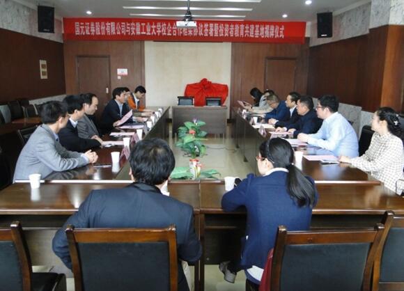 林钟高与蒋希敏共同签署了《校企合作框架协议》、《“金融实践教育奖学金”协议书》。陈润与蒋希敏共同为投资教育共建基地揭牌,并向国元证券颁发了安工大教育发展基金会“金融实践教育奖学金”捐赠证书。双方还就共建教育基地的发展规划、全面深度合作计划交换了意见并达成共识。