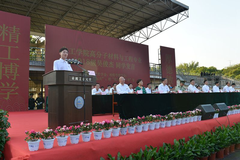 开学典礼上,能源与环境学院教授楚化强、校友代表张大明、化学与化工学院在校生吴俊杰、商学院新生姚雅忱先后发言。学校领导和来宾为新生代表佩戴校徽。校学生会主席团成员、计算机科学与技术学院任飞翔带领全体新生作入学宣誓。