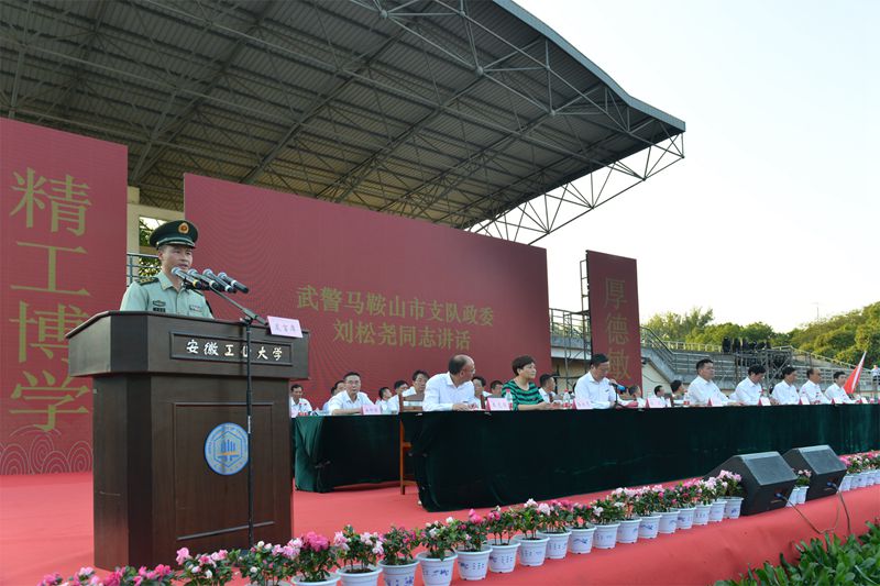 刘松尧在讲话中指出,安工大在“九·一八”这个特殊的日子新生军训开训,对增强国防理念,弘扬爱国精神,激发家国情怀具有重要意义。广大承训教官要不负信任、不负重托,科学组训、因人施训、安全保训,严守纪律、严格作风、树好形象,高标准完成军训任务。他希望同学们勇于挑战自我,除娇气、练胆气,去惰性、砺血性;乐于锤炼自我,战烈日、斗酷暑,比意志、拼作风;敢于超越自我,走前列、当标兵,扛红旗、争第一,迈好大学生活的第一步。