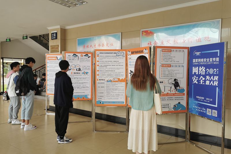在秀山校区第一教学楼大厅和佳山校区第一教学楼大厅,学校布置了“网络安全关乎国家安全”、“谨防电信网络诈骗”、“做好个人信息保护”、“保护你的密码”、“远离网络谣言”、“防范恶意软件”、“关注手机安全风险”等主题展板。丰富的内容和警醒的标语,吸引了师生驻足观看,让他们零距离感受网络安全的重要性。