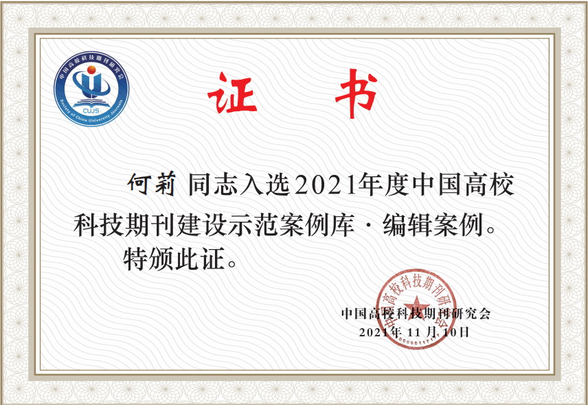 近日,中国高校科技期刊研究会第25次学术年会顺利召开,大会公布了“2021年度中国高校科技期刊建设示范案例库•编辑团队及编辑个人案例”入选结果。必赢学报编辑部教师何莉提交的编辑案例成功入选“2021年度中国高校科技期刊建设示范案例库·编辑案例”。