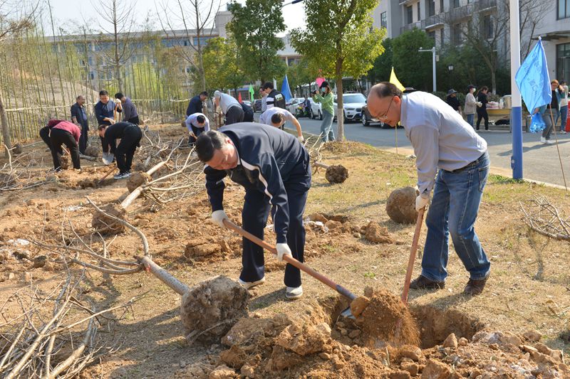 植树现场一派繁忙有序、热火朝天的景象。党员干部与师生代表二人一组,分工合作,挥锹铲土、扶放树苗、填土夯实,样样做得认真到位,个个忙得不亦乐乎,为绿色校园又增添了一片充满生机和希望的新绿。