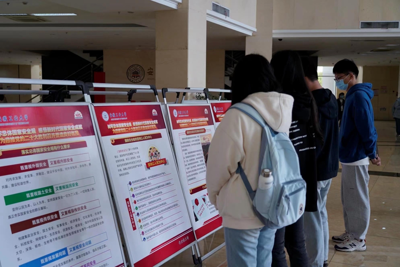 今年4·15全民国家安全教育日的活动主题是,树牢总体国家安全观,感悟新时代国家安全成就,为迎接党的二十大胜利召开营造良好氛围。学校充分利用线上线下渠道宣传普及国家安全知识,引导师生正确理解、认真践行总体国家安全观。安全保卫部印制国家安全知识和防诈知识单页,组织志愿者深入宿舍开展宣传,在教学楼、图书馆、警务站等场所摆放知识展架进行宣讲。党委宣传部、团委通过校园网、微信公众号、校园广播等推出国家安全教育日相关内容,学生工作部和各学院认真组织学生观看教育部《千万师生同上一堂国家安全教育课》直播。(撰稿:包恒庆 谢学华 审核:吴文兵 张苒 黄勇)