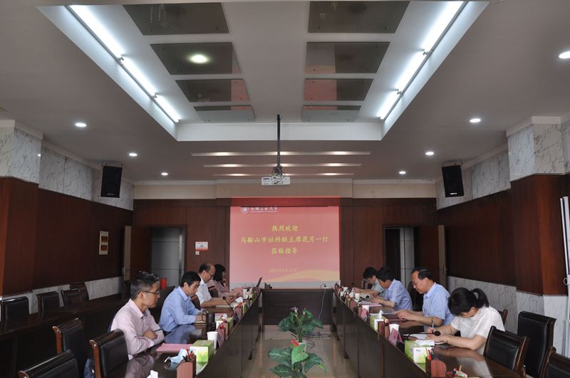 水恒福对花月一行的到来表示欢迎,对马鞍山市社科联长期以来对学校社科联工作的关心支持表示感谢。他简要介绍了学校在人才培养、科学研究、社会服务、文化传承创新、对外合作交流等方面的特色及成效,重点介绍了学校哲学社会科学的学科优势、特色成果和平台团队建设情况,水恒福指出,学校高度重视哲学社会科学发展,始终围绕贯彻落实习近平总书记关于哲学社会科学工作的重要论述和党中央关于加快构建中国特色哲学社会科学的重大决策部署,充分发挥高校作为我国哲学社会科学“五路大军”中的重要力量作用,主动服务国家战略和地方经济社会发展需求,近年来在长三角更高质量发展一体化发展、安徽省“三地一区”以及马鞍山市“生态福地、智造名城”建设等方面产出了许多高质量、真管用、接地气的智力成果。面向新发展阶段,学校将围绕迎接、宣传、贯彻党的二十大这条主线,把习近平新时代中国特色社会主义思想落实到哲学社会科学各个领域、各个方面,为走好奋进新征程的安徽赶考之路和学校“7+X”攻坚项目各项重点工作的顺利推进提供坚强思想保证和强大精神动力。希望马鞍山市社科联能够一如既往给予学校社科联更多支持,进一步深化合作,共同推动校地双方高质量发展。