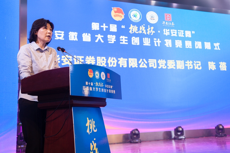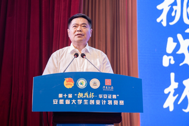 陆林代表大赛承办方致辞。他指出,学校高度重视创新创业教育,通过深化人才培养模式改革,将学生创新创业教育融入人才培养各环节、全过程,持续提高人才培养质量,创新创业成果丰硕,已成为全国首批深化创新创业教育改革示范高校、创新创业典型经验50强高校。广大青年在本次竞赛中激扬青春、碰撞智慧,充分体现了安徽青年敢于“挑战”、勇于担当、善于作为的良好精神风貌。学校将积极引领广大学子树立科学精神,提升创新创造创业能力,踊跃投身国家创新驱动发展战略,激励广大学子战胜新征程上共同的“挑战”,为建设现代化美好安徽贡献青春、智慧和力量。