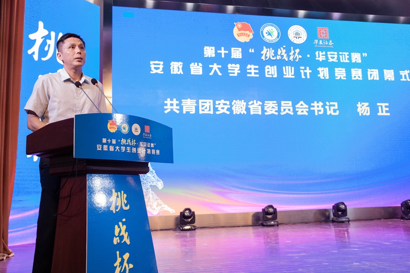 杨正代表团省委对本次大赛的组织工作和参赛作品给予充分肯定,并向获奖高校、团队表示祝贺。他指出,在深入学习宣传贯彻习近平总书记在庆祝中国共产主义青年团成立100周年大会上重要讲话精神之际举办本次比赛意义重大。省委、省政府高度重视和支持青年创新创业工作,大力实施创新发展战略,团省委按照省委省政府的部署要求,紧紧围绕中心工作,把服务大局和服务青年紧密结合起来,立足经济社会发展规律和学生成长成才规律,逐步将“挑战杯”打造成全社会多方位共同培养创新型人才的科创育人工作体系。广大青年学生要珍惜难得的历史机遇和人生际遇,立志高远,以乘风破浪的姿态勇立创新创业潮头;广大团学干部要牢记习近平总书记的殷切嘱托,以“国之大者”的胸怀服务好高校青年创新创业;各级团组织要自觉担当尽责,以自我革命的勇气推动创新创业大赛焕发活力,为建设现代化美好安徽,实现中华民族伟大复兴的中国梦贡献青春智慧和力量,以实际行动迎接党的二十大胜利召开。