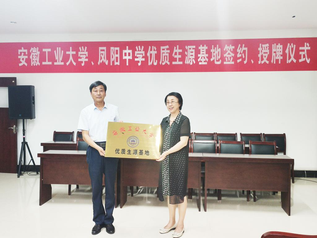 座谈会上,艺术与设计学院院长汪海波和陈勋刚共同签署优秀生源基地建设合作协议,顾明言代表学校向凤阳中学授予“优秀生源基地”牌匾。(撰稿:王乐琼 审核:方勇 汪海波 张苒 杜飞)