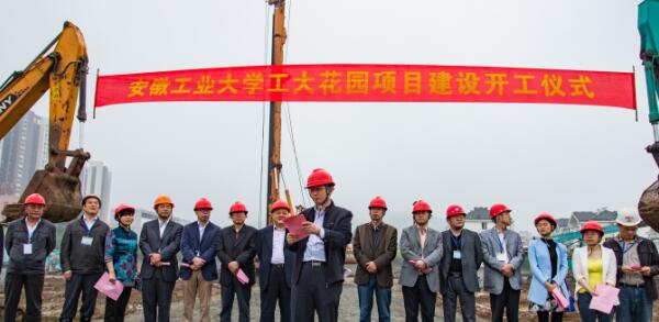 副校长魏先文宣布工大花园项目建设工程开工,并与有关人员一道为项目奠基石培土。