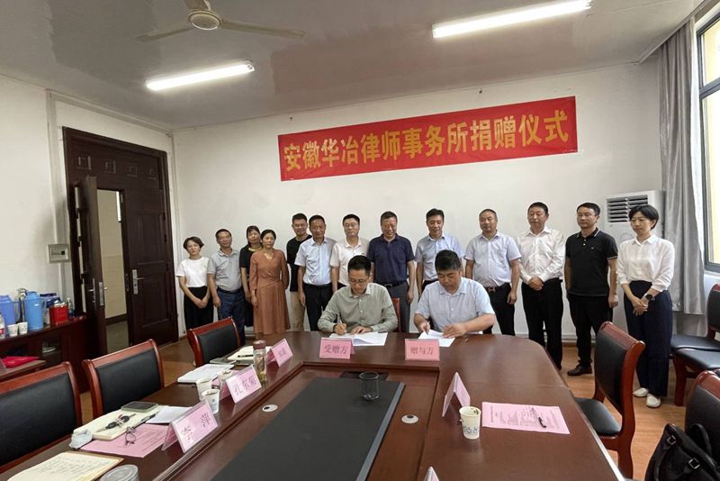 9月5日下午,安徽华冶律师事务所捐赠签约仪式在佳山校区举行,校党委副书记祖明出席。安徽华冶律师事务所合伙人会议主席周巧龙、安徽华冶律师事务所主任孙宁、安徽华冶律师事务所副主任周正东以及校友工作处(教育发展基金会秘书处)负责人、公共管理与法学院领导班子成员、法学系负责人参加仪式。