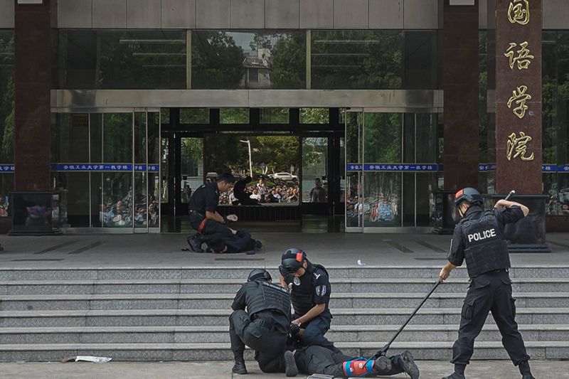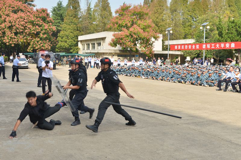 反恐演练模拟了某在校生因安全意识薄弱,在非法网站平台贷款用于追求物质消费,遭遇“不法分子”暴力逼债,校园安保和公安人员合力快速处置,成功保护学生免受人身和财产侵害的过程。以“惊心动魄”的场景,展现公安干警的应急处突战斗力,让在场师生感受到电信网络诈骗的严重危害。