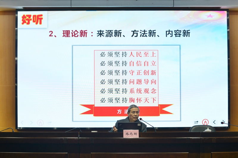 路丙辉教授以《高举旗帜 团结奋斗 勇毅前行》为题,结合自身参会感受和学习心得,围绕“好看”“好听”“好学”三个维度,从“伟大变革,取得举世瞩目的伟大成就”“伟大旗帜,取得重大的理论创新成果”“伟大梦想,必将取得举世无双的成功”三个方面对党的二十大报告进行全面深入的解读。