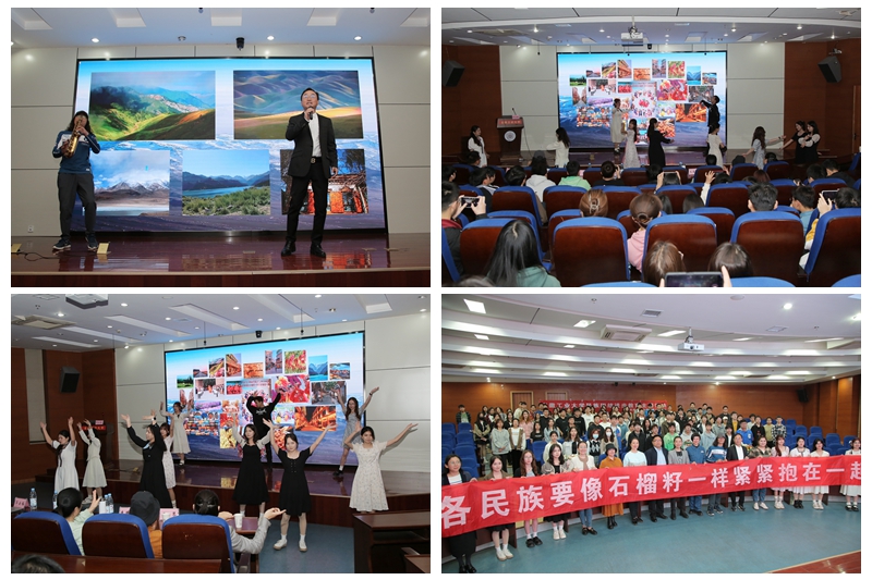 报告会特别邀请了马鞍山市音乐家协会副主席、连续四届全国冶金行业歌手大赛民族唱法金奖获得者男高音歌唱家刘松,国内著名音乐唱作人、中国音乐家协会、中国音乐著作权协会会员王瀚仪,马鞍山市艺术剧院萨克斯、吉他演奏家、马鞍山市音乐家协会管乐协会副会长、马鞍山市音乐家协会吉他协会副会长王劲松,中国舞蹈家协会会员、安徽省舞蹈艺术教育学会副会长、马鞍山市舞蹈家协会副主席、舞蹈家朱瑾斐,国家二级演员、马鞍山市艺术剧院王琴,为大家带来精彩的表演。王瀚仪改编的新疆歌曲《牡丹汗》,描述了大美新疆不一样的风景、不一样的魅力。刘松和王劲松联袂演绎了新疆歌曲《送你一朵玫瑰花》,沁人心脾,尽显西域柔情。在歌曲《爱我中华》的优美旋律中,少数民族学生们热情高涨,纷纷走上台前自由舞蹈、集体献舞,描绘出民族大团结大融合的壮美画面。