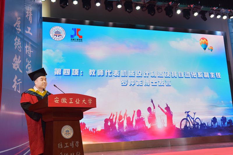 魏先文代表学校向圆满完成学业的毕业生表示祝贺,对机械工程学院2023届毕业生在思想引领、争先创优、科技创新等方面取得的优异成绩表示肯定。他以“踔厉奋发展风采,笃行不怠向未来”为题,寄语全体毕业生要以担当践行使命,争做“眼里有光”的开拓者,将自己的职业理想、学业理想和人生目标,同祖国的前途、民族的命运紧密联系在一起,主动担苦、担难、担重、担险,将安工大人的家国情怀和历史担当,浓墨重彩地写进中国式现代化的壮丽篇章。要以吃苦成就事业,争做“肩上有责”的奋斗者,学会运用习近平新时代中国特色社会主义思想的世界观和方法论,深刻领会“六个必须坚持”,精于工、匠于心、品于行,在立足本职的创新创造中不断积累经验、取得成果,成长为一专多能的复合型人才。要以感恩回馈社会,做“心中有爱”的奉献者,树牢正确的世界观、人生观和价值观,践行社会主义核心价值观,坚守道德底线和法纪红线,清白做人、干净做事,摆正个人与团队的关系,对单位和家庭尽责,心系母校、奉献国家。