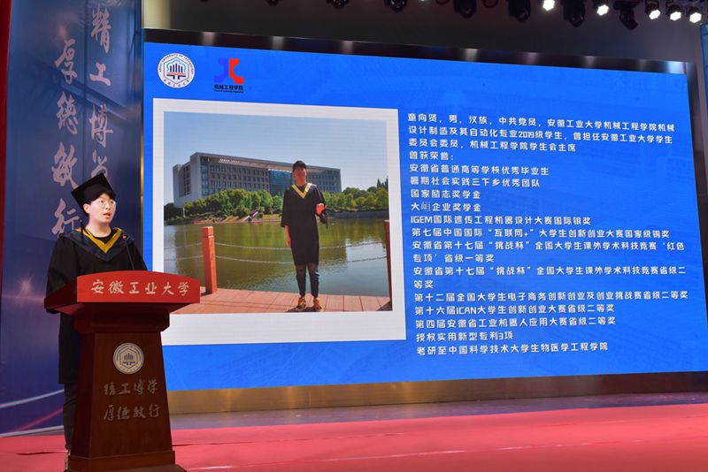 教师代表罗仲龙向毕业生们送上了“学会内省,持续学习”、“学会勇气,敢于践行”、“学会选择,懂得责任”的临别赠言;家长代表樊勇表达了对学校的由衷感激和美好祝愿;研究生毕业生代表应万明深情感怀“幸入工大,幸得良师,幸遇良友”的九年在校时光;本科生毕业生代表童向贤回顾了大学的难忘点滴,表达了对母校的感恩之情。
