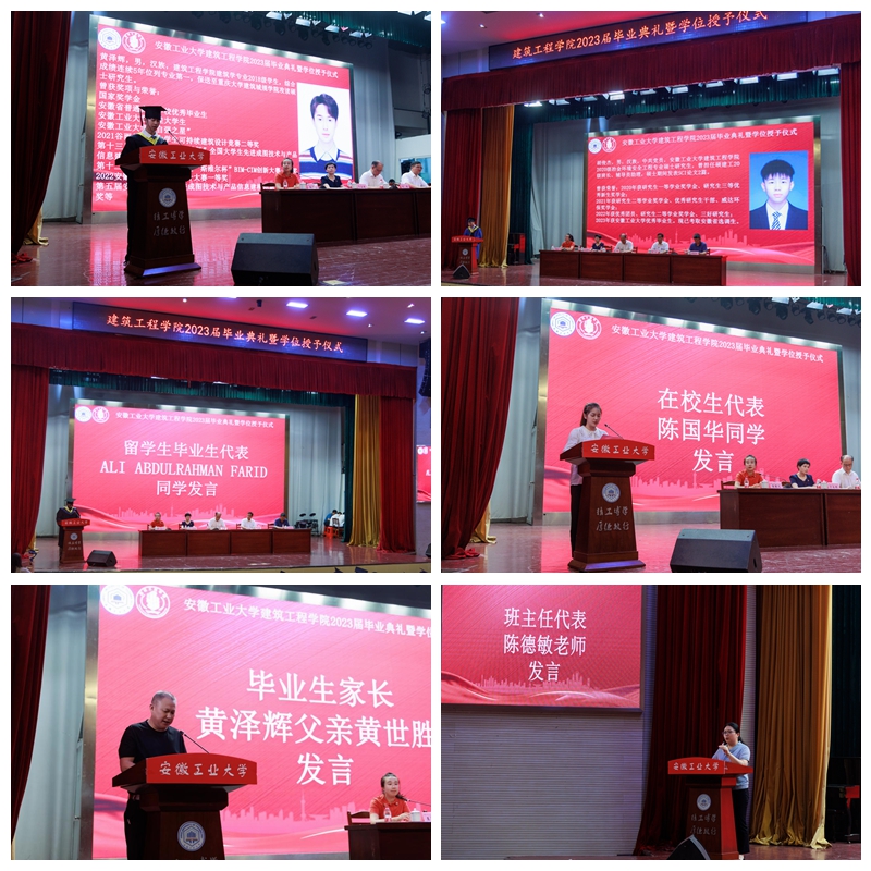 本科生代表2018级建筑学专业黄泽辉同学深情表达了对母校、对老师、对同学的感激和不舍。研究生代表2020级冶金环境安全工程专业胡俊杰同学结合自身的学习科研,表达对母校的热爱之情。留学生代表ALIABDULRAHMANFARID由衷感谢母校的培养,让他学会了勇敢与坚强、自信与务实。在校生代表2020级建筑学专业陈国华同学向即将毕业的学长学姐们表达了感谢和祝福。家长代表黄世胜先生向学校、学院老师辛勤付出致以崇高的敬意和诚挚的感谢,祝愿学校、学院发展越来越好。教师代表陈德敏鼓励毕业生们以积跬步致千里,以全新的姿态适应社会发展需求。