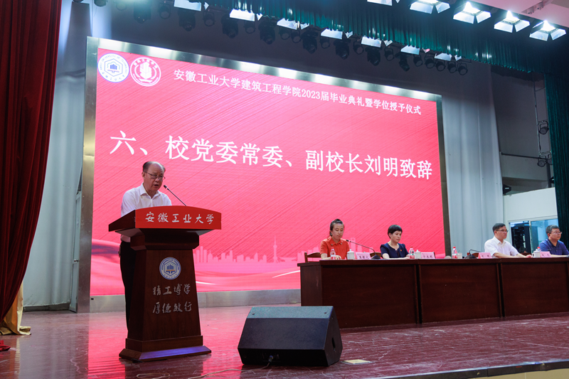 刘明代表学校向所有毕业生表示热烈的祝贺,对建筑工程学院2023届毕业生在思想引领、创新创业、志愿服务等方面取得的优异成绩表示肯定。他以“建功新时代,筑梦向未来”为题,寄语全体毕业生要志存高远,做坚守理想的实干者;要固守本真,做勇于担当的奋斗者;要行稳致远,做脚踏实地的追梦者。把握好人生定位,吃苦耐劳,勤钻研、多读书,将自身学习、实践与理论、启示结合起来,脚踏实地走好人生每一步,努力撑起国家的未来、民族的期望。