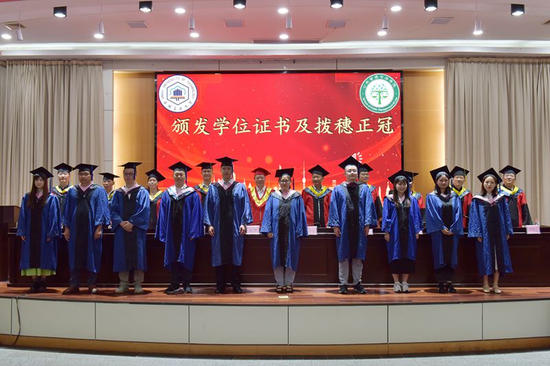 学位授予仪式上,在主席台就座的领导老师为2023届毕业生扶苏正冠,颁发毕业证书、学位证书,并合影留念。