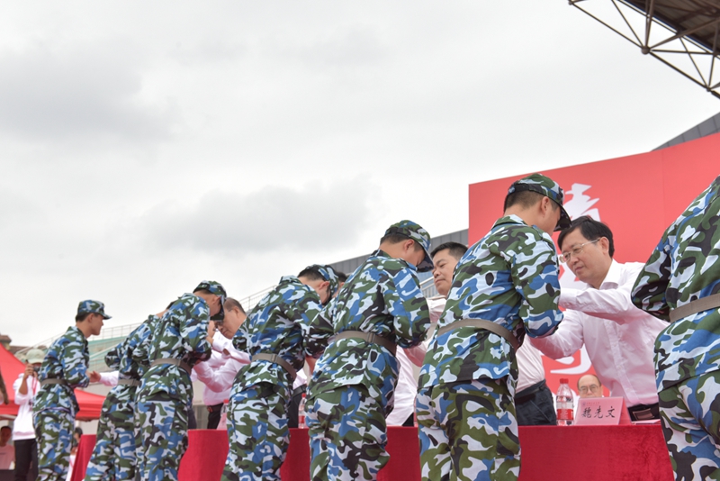 与会校党政领导为新生代表佩戴校徽,全体新生将校徽佩戴在胸前,进行入学宣誓。