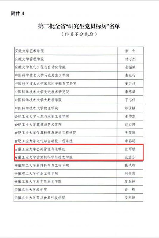 自教育部和安徽省实施新时代高校党建示范创建和质量创优工作以来,学校先后入选“全国党建工作样板支部”5个,全国高校“百名研究生党员标兵”1名;入选省级“标杆院系”培育创建单位新增至2个,省级“样板支部”“研究生样板支部”新增至14个,省级“研究生党员标兵”新增至5名,入选省级高校“双带头人”教师党支部书记工作室1个。