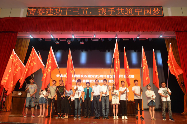 出征仪式上,全国青年五四奖章获得者、 全国优秀青年志愿者、岳西县毛尖山乡留守儿童服务中心主任、板舍敬老院院长刘磊作为社会实践基地代表发言;中国科学技术大学社会实践团队指导老师戴玮、必赢“井冈情·中国梦”社会实践团队队长丁明珠分别作为社会实践指导老师和队员代表发言。全体社会实践队员现场宣誓。李丹云和陈润为安徽省社会实践团队和2016安徽省“井冈情·中国梦”社会实践团队代表授旗,标志着全省大学生暑期“三下乡”社会实践活动拉开序幕。(撰稿:祝小迁 审稿:王先柱 邹珏)