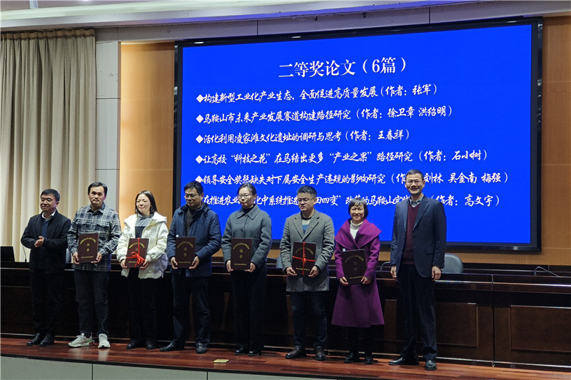 在学术成果交流暨颁奖活动环节,管理科学与工程学院副教授陈梦凯、马鞍山市委党校副教授沈洁、马鞍山市政府发展研究中心主任石小树、马鞍山市经济学会博士徐卫章、马鞍山职业技术学院副教授周朋,代表我市社科界“五路大军”作交流发言。