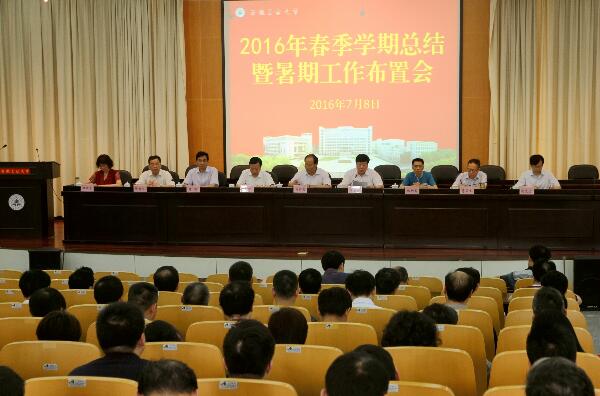 李家新在总结中指出,上半年在教学工作方面,学校以改革思维推进教学规范化建设,以广泛宣传促进招生工作良性发展,以创新精神助力“双创”教育争先进位,以服务社会打造继续教育发展空间;在学生管理与就业工作方面,学校用思想引领实践,用管理营造学风,用荣誉激励队伍,用民生衡量就业;在学科建设与科研工作方面,学校以评估促进学科与学位点建设,以实干实现科研经费上升,以政策激励科研项目“五连增”,以政产学研合作拓展服务领域;在师资队伍建设方面,学校加大了人才引进力度、人才项目选拔、教师培养培训力度;在校园基本建设和民生工程建设方面,重点工程建设保障了学校的发展,数字校园建设高标准运行,相关维修改造工作按计划进行,商住楼建设取得突破性进展,工商学院新校区建设全面铺开;在综合管理服务方面,以集思广益为渠道,编制了“十三五”事业发展规划和深化综合改革方案,以建章立制为抓手,推进院(部)治理和学校人事制度改革,以提高效益为目的,促进资产、财务管理及审计工作上水平,以立足保障为要求,加强后勤保卫服务工作,以服务校友为纽带,争取更多办学资源;在党建和思想政治工作方面,“两学一做”学习教育扎实开展,全面从严治党深入推进,干部选拔、培训和监督管理进一步加强,宣传思想文化工作传播了正能量,民主管理工作得到保障,党风廉政建设保证了学校风清气正。