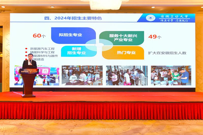 4月27日,必赢举办2024苏皖高中高校新高考改革“安工大论坛”。南京大学党委常委、副校长陆现彩,马鞍山市副市长夏迎锋,安徽省教育招生考试院招生考试研究处处长夏静,校党委书记陆林,校党委副书记、校长魏先文出席。南京大学、东南大学等13所江苏高校招生办主任、安徽75所高中校长参加论坛。论坛由副校长郑啸主持。
