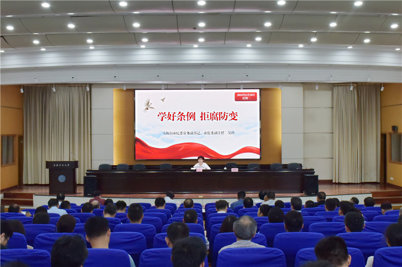 会议还邀请了马鞍山市纪委常务副书记、监委副主任吴玲作了题为《学好条例 防腐拒变》专题辅导报告,报告从党的“六大纪律”主旨要义切入,结合违纪违法典型案例,特别是马鞍山市和高校的典型案例,对《中国共产党纪律处分条例》进行了系统解读。(撰稿:何继伟 审核:汪旭东 张文明 张苒 黄敏)