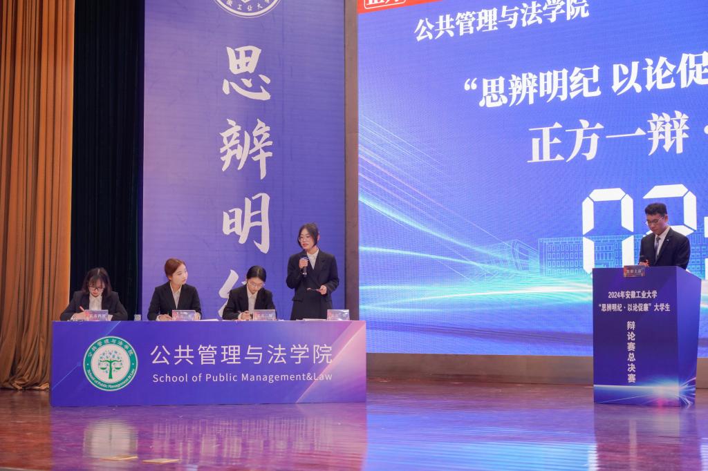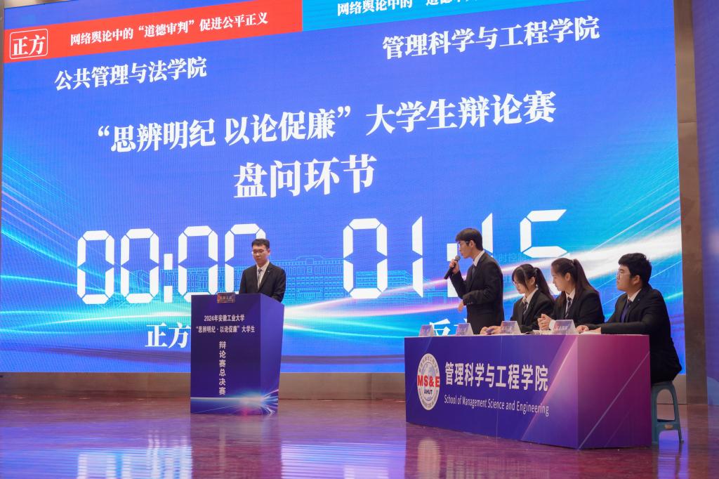 决赛现场,公共管理与法学院代表队与管理科学与工程学院代表队围绕辩题“网络舆论中的‘道德审判’是促进公平正义还是阻碍公平正义”展开了深入的探讨和激烈的交锋。在开篇陈词、驳辩盘问、自由辩论、总结陈词等环节中,正反双方慷慨激昂、引经据典、妙语连珠、针锋相对,辩手们以独到的见解、严谨的逻辑推理、流畅的语言表达、深厚的知识积累、敏捷的临场反应,展现了他们的思辨能力和批判性思维,为观众们呈现了一场精彩绝伦、直击心灵的视听盛宴。