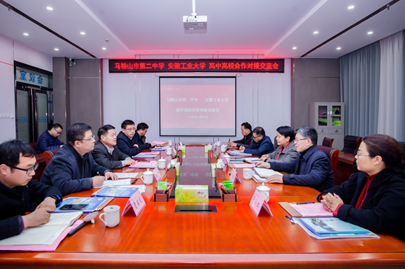 郑啸介绍了学校的基本情况和办学成效,表示学校将积极通过开放实验室、委派专家举办学术和科普讲座等方式,助力马鞍山二中在科学教育、拔尖创新人才培养等方面的发展,同时欢迎马鞍山二中的优秀学子报考安工大。