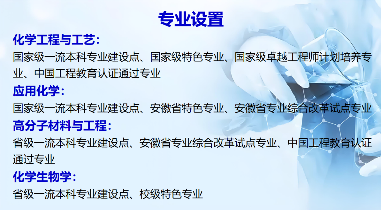 学院现有化学和化学工程与技术一级学科硕士学位授权点2个,材料与化工和生物与医药硕士专业学位授权点2个,化学一级学科博士学位授权点1个,材料与化工博士专业学位授权点1个。化学学科入选安徽省高峰学科,并持续保持ESI排名前0.48%,化学工程入选2024软科世界一流学科排名。纳米科学与工程入选安徽省高峰培育学科,纳米能源与环境技术入选安徽省特色学科。学科引领专业建设屡上台阶,开设的4个本科专业中,获批国家级一流本科专业建设点2个(化学工程与工艺、应用化学),获批安徽省一流本科专业建设点2个(高分子材料与工程、化学生物学),通过工程教育认证专业2个(化学工程与工艺、高分子材料与工程),通过率100%。获批国家级特色专业与卓越工程师培养计划1个,省级特色专业1个,本科留学生招生资格专业1个。