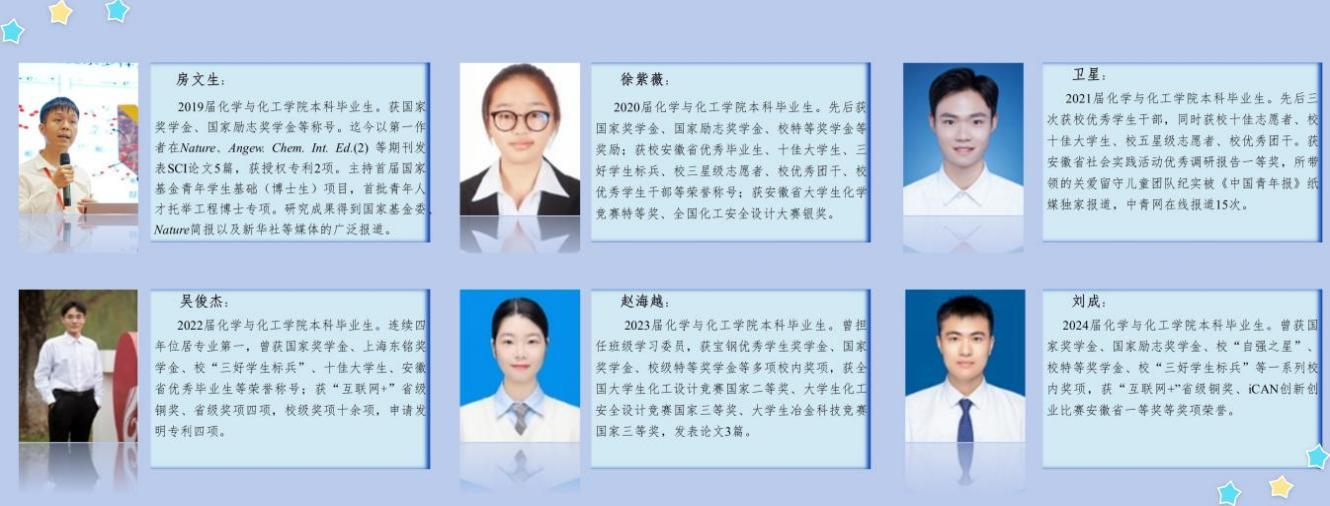 近五年,学院学生在学科竞赛和创新创业方面取得系列成果,累计获得"挑战杯"全国大学生系列科技学术竞赛、中国国际大学生创新大赛、全国大学生化工设计竞赛等赛事国家级奖项60余项、省级奖项150余项,承担国家级和省级大学生创新创业训练计划项目160项。毕业生发展态势良好,本科生就业率保持在95%以上,多名优秀学子入职宝武集团、中石化、万华化学等头部企业。同时,毕业生考研录取率持续位居全校前列,并在深造期间持续展现科研潜力,先后有研究生获国家自然科学基金青年学生基础研究项目(博士生培养专项)立项资助、入选青年人才托举工程计划,其中1名学生更以第一作者身份在Nature正刊发表创新成果。