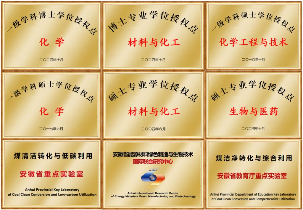 学院建成专业基础课程、特色课程、一流课程三维协同课程体系。其中,国家级一流本科课程2门(化工原理A、无机化学)、省级专业特色课程10门、六大化学(无机化学、有机化学、物理化学、分析化学、高分子化学、生物化学)及实验省级精品基础课程8门,省校两级课程思政示范课程7门;获批化学实验示范中心、有机化学示范实训中心、化工过程虚拟仿真实验教学中心等省级教学平台3个和省级校企合作实践基地5个;获批煤清洁转化与低碳利用安徽省重点实验室、安徽省能源材料绿色制造与生物技术国际联合研究中心等省级科研平台3个。