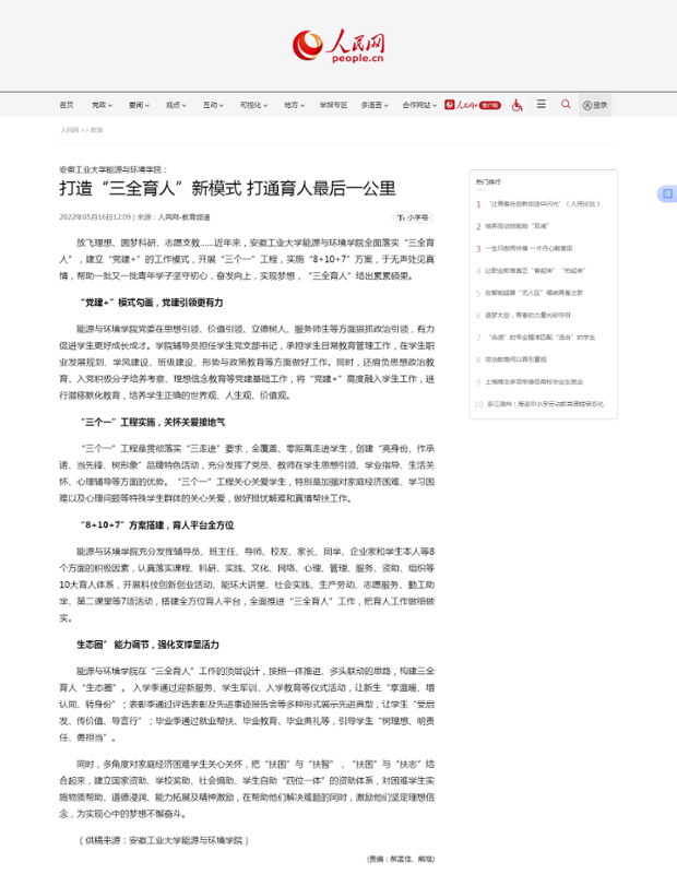 学院严格落实《能源与环境学院“三全育人”工作的实施方案》,紧扣实效,从制度层面确保育人工作规范有序开展,促进学生稳固专业思想。学院充分发挥辅导员、班主任、导师、校友、家长、同学、企业家和学生本人等8方面积极作用,认真落实课程、科研、实践、文化、网络、心理、管理、服务、资助和组织等10大育人体系,深入开展科技创新创业活动、能环大讲堂、社会实践、生产劳动、志愿服务、勤工助学和第二课堂等7项活动,打通育人“最后一公里”。