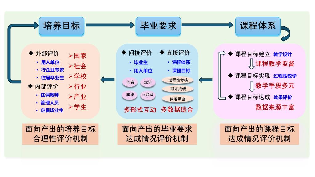 学院基于专业特色,在学校相关规章制度的基础上制定、补充和完善相应的实施细则,覆盖教学准备、课程管理、评价反馈等过程。建立面向产出的毕业要求达成情况评价机制,确保评价结果用于持续改进。
