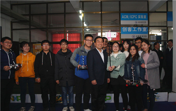 在创新教育学院创客工作坊,信长星看望了正在备战安徽省第四届工程训练综合能力竞赛的同学们,观看了S字型、8字型、电控等3个类型的无碳小车模拟训练,了解了比赛规则,并应邀与参赛同学合影。他说:“年轻人有创新创造的活力,跟年轻人在一起,我们的心态都很年轻。”他还走进无人机和机器人联合模拟实验室,饶有兴致地观看了精彩的机器人表演,对学生的创新精神和实践能力予以肯定,鼓励同学们培养创新意识,激发创新潜能,体验创新过程。随后,他参观了工程文化墙和学子创新荣誉墙,了解了学校在各级各类创新创业比赛中的获奖情况,并给予了高度评价。