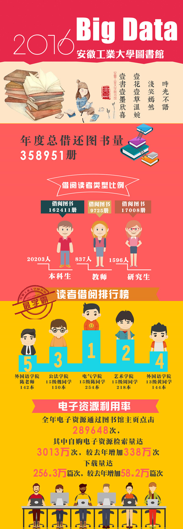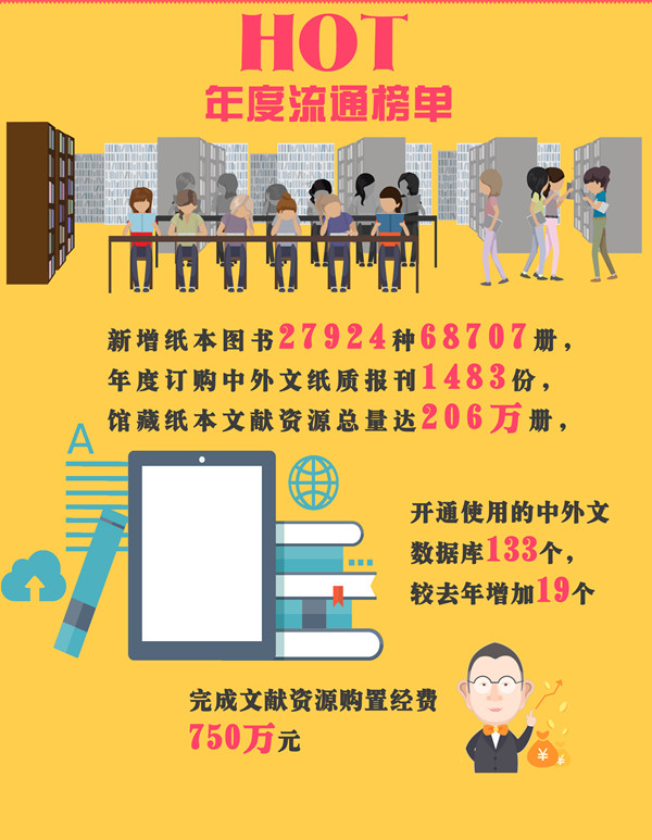 图书馆“2016年度大数据”由“人气榜单”、“流通榜单”等多个板块组成,内容丰富,涵盖开放安排、读者接待、资源利用、讲座培训等全年主要服务数据、馆藏数据和用户数据,全方位呈现出图书馆一年来服务理念及服务质量的大幅提升。