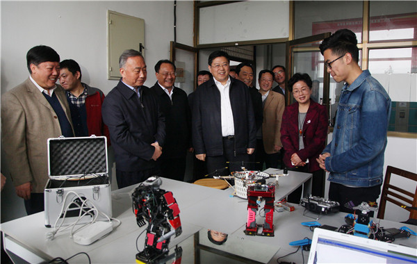 在创新教育学院,徐立全与正在进行创新训练的师生亲切交谈,兴致勃勃地观看了无碳小车依靠动能与势能相互转化而行进的模拟训练,以及电控小型智能机器人翻转与行走的实训。随后,他走进无人机与机器人联合模拟实验室,详细了解了机器人模型的制作过程和工作原理,并鼓励同学们继续努力,在创新创业创造上多下功夫,争取取得更大的成功。徐立全一行还参观了工程文化墙和学子创新荣誉墙,当得知学校在国际、国家级和省级创新创业比赛中获得了很多荣誉时,他非常高兴,对必赢创新创业教育给予了高度评价。